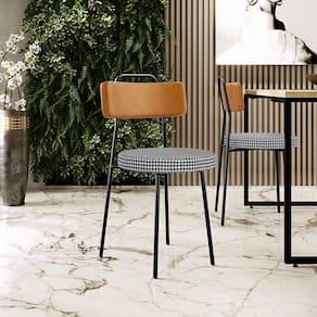 Revestimento do encosto em Couríssimo na cor Whisky e do assento em Veludo na cor Pied Poule, com acabamento semi brilho.