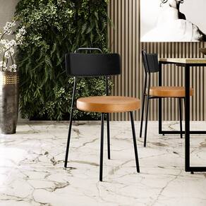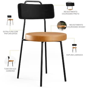 Revestimento do encosto em Couríssimo na cor Preto e do assento em Couríssimo na cor Whisky, com acabamento semi brilho.