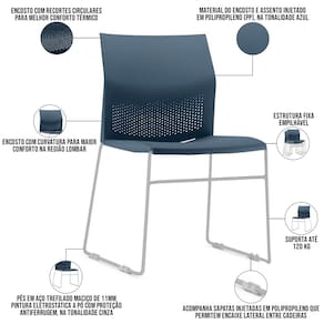 Material do encosto e assento injetado em Polipropileno (PP), na tonalidade Azul.