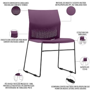 Material do encosto e assento injetado em Polipropileno (PP), na tonalidade Roxo.