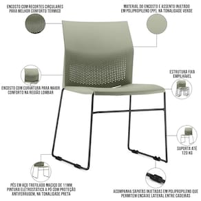 Material do encosto e assento injetado em Polipropileno (PP), na tonalidade Verde.
