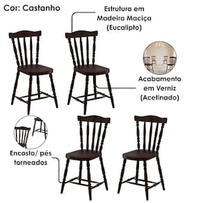 Cadeiras 250EA, o kit com design clássico e elegante, ideal para compor o ambiente da sua cozinha! Com estrutura 100% em madeira maciça, acabamento em verniz acetinado. Conta com encosto e pés torneados (3,8 cm de largura) que agregam ainda mais sofisticação ao design. Possui assento em madeira maciça (2,3 cm de espessura). Suporta até 120 kg, garantindo segurança e conforto. NÃO ACOMPANHA OBJETOS NEM DEMAIS DECORAÇÕES. Este produto será entregue em 2 volumes.