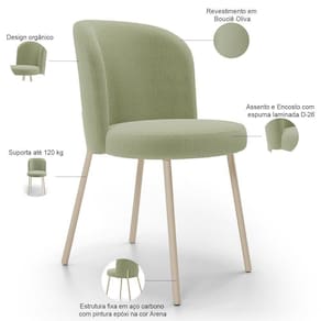 Color: Oliva | ColorSimple: Oliva | ProductWidth: 87 | OriginState: PR | Model: Gavi | ProductWeight: 20 kg | Espessura do assento: na | ColorFamily: Oliva | Fabricante: Lyam Decor | ProductLength: 101 | ColorSupplier: Oliva | Cor: Oliva | ProductHeight: 86 | Cor do estofamento: Oliva | OriginCountry: | ProductWarranty: 90 dias após o do produto | ProductInstructions: Produto para uso residencial em ambiente interno, não devendo ficar exposto diretamente ao sol, calo | SizeDescription: 86 x 87 x 101 cm | SupplierSimpleName: Kit 04 Cadeiras Para Sala de Jantar Cozinha Estofada Gavi Arena L02 Bouclê Oliva - Lyam Decor | Cor do assento: Oliva | ProductContents: 04 Cadeiras | MaterialFamily: Madeira, Espuma, Bouclê | Material: Madeira, Espuma, Bouclê | É empilhável: Não | Requer montagem: Não | Largura da cadeira: 44 cm | Tempo de montagem: na | É cadeira de balanço: Não | Desenho do tecido: Liso | Cor da estrutura da cadeira: Arena | Altura da cadeira: 80 cm | Material do estofamento: Madeira, Espuma, Bouclê | Profundidade da cadeira: 53 cm | É dobrável: Não | Peso máximo suportado: 120 kg | Altura do assento a partir do solo: 46 cm | Profundidade do assento: 42 cm | Firmeza: Sim | Largura do assento: 42 cm