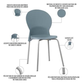 Material do encosto e assento injetado em Polipropileno (PP) 100% reciclável, na tonalidade Azul.