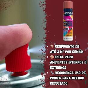 Tinta Spray 400ml Vermelho Uso Geral em Aço Ferro Couro Gesso Cerâmica A Tinta Spray 400ml Vermelho Uso Geral é a solução prática para renovar superfícies de metal, gesso, couro e cerâmica. Ideal para dar vida nova a bicicletas, móveis, eletrodomésticos e objetos em geral, garantindo um acabamento moderno e duradouro. Com fórmula de alta qualidade, oferece excelente aderência e acabamento Brilhante, além de resistência superior contra desgastes do dia a dia. Sua cobertura uniforme realça os detalhes e proporciona um resultado em poucas camadas. Prática e fácil de aplicar, a tinta spray seca ao toque em apenas 15 minutos, permitindo agilidade nos trabalhos e economia de tempo. O rendimento de até 2 m por demão garante maior aproveitamento do produto e ótimo custo-benefício. Diferenciais: Acabamento Brilhante com ótima aderência Alta durabilidade e resistência em ambientes internos e externos Secagem rápida e aplicação prática com cobertura uniforme Especificações TÉCNICAS: Volume: 400ml Rendimento: até 2 m por demão Superfícies indicadas: metal, gesso, couro e cerâmica Secagem: toque em 15 minutos Acabamento: Brilhante Recomendação: uso de primer para melhor desempenho Itens INCLUSOS: 04 Tintas Spray 400ml Vermelho Uso Geral Marca: Não Informado