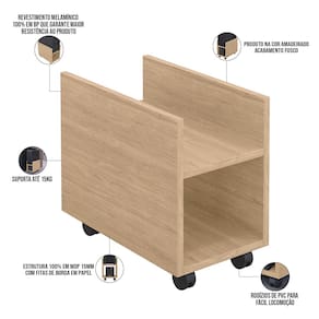 Características: Estrutura 100% em MDP 15mm. Fitas com borda de papel. Revestimento melamínico 100% em BP, que garante maior resistência ao produto. 04 rodízios de PVC para fácil locomoção. Suporta até 15Kg. Prateleira com largura de 19cm. Produto na Cor Amadeirado, com acabamento Fosco.