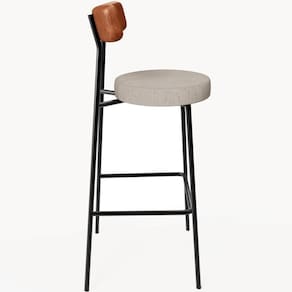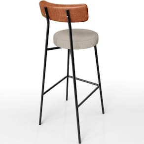Revestimento do encosto em Couríssimo na cor Camel e assento revestido em Linho na cor Bege, com acabamento semi brilho.