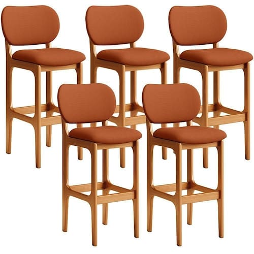 Amplamente sofisticada, o Kit 05 Banquetas Alta Bar Cozinha Sala Jantar Fixa Betta L02 Imbuia Tecido Terracota - Lyam Decor irá agregar ainda mais valor em sua decoração!! Sendo capaz de compor muito bem o ambiente, é produzida com materiais de excelente qualidade, a resistente estrutura em madeira de Taeda, na cor imbuia, conta com apoio para os pés (que garante maior segurança), além do assento e encosto estofados super confortáveis e convidativos, que são revestidos em tecido terracota, extremamente elegante.
