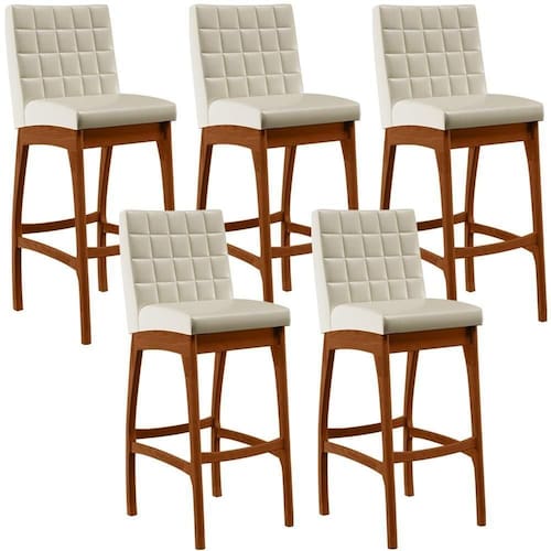 ndo muita excelência, o Kit 05 Banquetas Alta Para Cozinha Sala de Jantar Fixa Mila L02 Facto Pérola Metalizado - Lyam Decor é o complemento que faltava para deixar sua casa ainda mais extraordinária. Seu encosto com costura em padrão quadriculado e assento estofados, centralizam em si uma graciosidade estonteante, sem perder todo o seu conforto. A estrutura em madeira, na cor nozes, também é digna de notoriedade, por imprimir bastante personalidade a sua decoração. Vale ressaltar ainda, o apoio para os pés que garante maior à mesma.