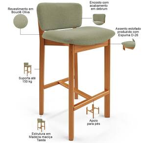 Model: Banqueta Dara | OriginCountry: | SizeDescription: Altura: 83cm x Largura: 47cm x Profundidade: 47cm | Diâmetro: na | Cor: Oliva | Estilo: Clássico | Com estofado: Sim | Com apoio de braços: Não | Com rodas: Não | ProductContents: 05 Banquetas | ProductHeight: 83 cm | ProductWidth: 47 cm | SupplierSimpleName: Kit 05 Banquetas Alta Para Cozinha Sala de Jantar Bar Dara L05 Bouclê Oliva - Lyam Decor | Com espaço de armazenamento: Não | Material do estofamento: Bouclê | Cor do assento: Oliva | Cor do estofamento: Oliva | Largura da cadeira: 47 cm | Material: Madeira e Espuma | Color: Oliva | OriginState: PR | MaterialFamily: Madeira e Espuma | Tipo de produto: Banqueta | ProductWeight: 50 kg | Peso: 50 kg | Requer montagem: Não | Profundidade do assento: 37 cm | ProductLength: 47 cm | ProductWarranty: 90 dias após o do produto | Quantidade de Caixas de embalagem: 1 | É dobrável: Não | ProductInstructions: Produto para uso residencial em ambiente interno, não devendo ficar exposto diretamente ao sol, calo | Peso máximo suportado: 150 Kg | Cor da estrutura da cadeira: Castanho | Fabricante: Lyam Decor | Largura: 47 cm | É cadeira de balanço: Não | Profundidade da cadeira: 47 cm | É empilhável: Não | Altura da cadeira: 83 cm | Altura do assento a partir do solo: 74 cm | Desenho do tecido: Liso | Largura do assento: 45 cm | Espessura do assento: na