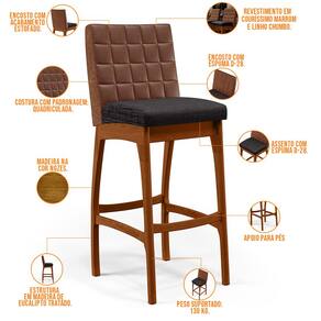 Entregando muita excelência, o Kit 05 Banquetas Altas Cozinha Sala Jantar Fixa Mila B04 Couríssimo Marrom Linho Chumbo - Lyam Decor é o complemento que faltava para deixar sua casa ainda mais extraordinária. Seu encosto com costura em padrão quadriculado e assento estofados, centralizam em si uma graciosidade estonteante, sem perder todo o conforto. A estrutura em madeira, na cor nozes, também é digna de notoriedade, por imprimir bastante personalidade a sua decoração. Vale ressaltar ainda, o apoio para os pés que garante maior segurança à banqueta.