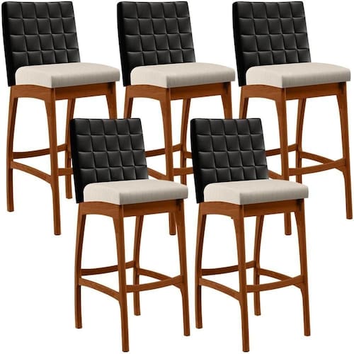 Entregando muita excelência, o Kit 05 Banquetas Altas Cozinha Sala De Jantar Fixa Mila B04 Couríssimo Preto Linho Cru - Lyam Decor é o complemento que faltava para deixar sua casa ainda mais extraordinária. Seu encosto com costura em padrão quadriculado e assento estofados, centralizam em si uma graciosidade estonteante, sem perder todo o conforto. A estrutura em madeira, na cor nozes, também é digna de notoriedade, por imprimir bastante personalidade a sua decoração. Vale ressaltar ainda, o apoio para os pés que garante maior segurança à banqueta.