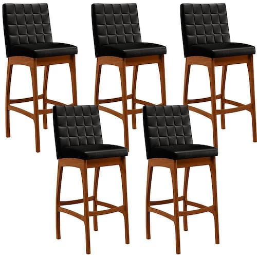 ndo muita excelência, a Kit 05 Banquetas Altas Para Cozinha Sala de Jantar Fixa Mila B04 Couríssimo Preto - Lyam Decor é o complemento que faltava para deixar sua casa ainda mais extraordinária. Seu encosto com costura em padrão quadriculado e assento estofados, centralizam em si uma graciosidade estonteante, sem perder todo o seu conforto. A estrutura em madeira, na cor nozes, também é digna de notoriedade, por imprimir bastante personalidade a sua decoração. Vale ressaltar ainda, o apoio para os pés que garante maior à mesma.