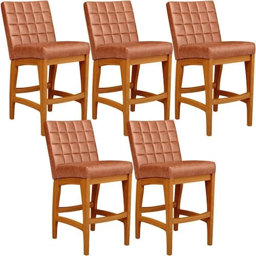 ndo muita excelência, o Kit 05 Banquetas Baixas Para Cozinha Bancada Bar Sala De Jantar 90 cm Fixa Mila L02 Couríssimo Camel - Lyam Decor é o complemento que faltava para deixar sua casa ainda mais extraordinária. Seu encosto com costura em padrão quadriculado e assento estofados, centralizam em si uma graciosidade estonteante, sem perder todo o seu conforto. A estrutura em madeira, na cor nozes, também é digna de notoriedade, por imprimir bastante personalidade a sua decoração. Vale ressaltar ainda, o apoio para os pés que garante maior à mesma.