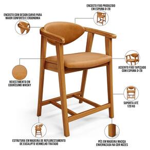 Características: Estrutura em madeira de reflorestamento de eucalipto vermelho tratado. Revestimento em tecido Couríssimo de alta qualidade na cor Whisky Assento e encosto fixos tapeçados com espuma D-28. Encosto com design curvo para maior conforto e ergonomia. Pés em madeira maciça envernizada na cor Nozes. Peso suportado: Até 120 kg cada.