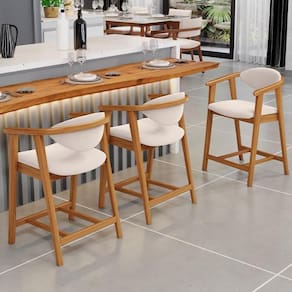 Esse kit de banquetas combina design moderno e funcionalidade, já que é ideal para cozinha, sala de jantar, bancada ou área gourmet. Além disso, são feitas com madeira de eucalipto vermelho tratado, o que garante durabilidade e sustentabilidade. Já o assento e encosto estofados com espuma de alta densidade proporcionam máximo conforto durante suas refeições ou momentos de descontração.