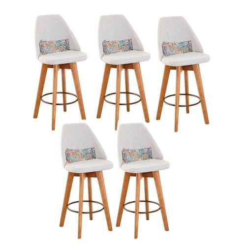 Kit 05 Banquetas Alta Maya Giratória Com Encosto Gourmet Linho Bege E Almofada Folhas - Gat Magazine Banqueta Maya Giratória - GAT MAGAZINE A Banqueta Maya possui assento e pés em madeira eucalipto com sistema giratório! Os pés contam com um reforço que proporciona um suporte de peso de até 120 Kgs.O assento é revestido com espuma D-23. Além de bonita e charmosa, vai trazer para seu ambiente elegância e proporcionará conforto para sua família e amigos nos momentos de lazer.