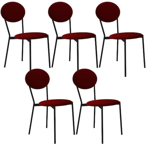 Profundidade da cadeira: 53 cm | Profundidade do assento: 42 cm | OriginState: PR | Firmeza: Firme | ProductWeight: 28 kg | ProductHeight: 258 cm | Cor da estrutura da cadeira: Preto | Altura da cadeira: 86 cm | Cor: Vermelho vinho | Color: Vermelho | ColorFamily: Vermelho | ColorSimple: Vermelho | ColorSupplier: Vermelho Vinho | Cor do estofamento: Vermelho vinho | Material: Estrutura em Aço e MDP, Revestimento em Veludo | Model: Azuri | OriginCountry: Brasil | ProductContents: 05 Cadeiras | SizeDescription: Altura: 258 cm x Largura: 43 cm x Profundidade: 53 cm | ProductLength: 53 cm | ProductWidth: 43 cm | Peso máximo suportado: 120 kg | Tempo de montagem: na | Largura da cadeira: 43 cm | Largura do assento: NA | ProductWarranty: 90 dias após o recebimento do produto | ProductInstructions: Produto para uso em ambiente interno, nao devendo ficar exposto ao sol, calor e umidade excessivos. | Desenho do tecido: Liso | É cadeira de balanço: Não | Cor do assento: Vermelho | Material do estofamento: MDP, Espuma D22D28 e Veludo | Fabricante: Lyam Decor | MaterialFamily: Aço, MDP e Veludo | SupplierSimpleName: Kit 05 Cadeiras Estofada Para Sala de Jantar Azuri Preto C01 Veludo Vermelho Vinho - Lyam Decor | Espessura do assento: na | Altura do assento a partir do solo: 49 cm | É dobrável: Não | É empilhável: Não | Requer montagem: Não