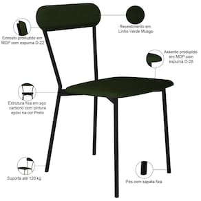 Color: Verde | OriginCountry: | Profundidade da cadeira: 53 cm | Largura da cadeira: 43 cm | Peso máximo suportado: 120 kg | MaterialFamily: Aço, MDP, Linho e espuma | OriginState: PR | SupplierSimpleName: Kit 05 Cadeiras Estofada Para Sala de Jantar Liora Preto C01 Linho Verde Musgo - Lyam Decor | Cor do assento: Verde Musgo | É empilhável: Não | Material: Estrutura em Aço e MDP, Revestimento em Linho e espuma | É dobrável: Não | Firmeza: Firme | ProductContents: 05 Cadeiras | SizeDescription: Altura: 243 cm x Largura: 43 cm x Profundidade: 53 cm | É cadeira de balanço: Não | Tempo de montagem: na | Altura do assento a partir do solo: 49 cm | Cor: Verde Musgo | ColorFamily: Verde | ColorSimple: Verde | ColorSupplier: Verde Musgo | Cor do estofamento: Verde Musgo | Fabricante: Lyam Decor | Model: Liora | ProductLength: 53 cm | ProductWidth: 43 cm | ProductWarranty: 90 dias após o do produto | ProductHeight: 243 cm | ProductInstructions: Produto para uso em ambiente interno, nao devendo ficar exposto ao sol, calor e umidade excessivos. | ProductWeight: 5,5 kg | Desenho do tecido: Liso | Cor da estrutura da cadeira: Preto | Material do estofamento: Espuma D-22 e D-28 | Altura da cadeira: 243 cm | Profundidade do assento: 53 cm | Largura do assento: 43 cm | Requer montagem: Não | Espessura do assento: na