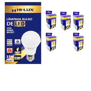05 - LÂMPADAS LED BULBO 15W 6500KA linha de lâmpadas LED HILUX é indicada para retrofit de lâmpadas incandescentes ou fluorescentes, em diversos tipos de aplicações para ambientes internos.PROPRIEDADES¿ Lâmpadas certificadas pelo INMETRO.¿ Formato similar às lâmpadas incandescentes tradicionais.¿ Corpo em policarbonato branco e difusor em policarbonato branco leitoso.¿ Possui driver interno isolado.CARACTERÍSTICAS DE FUNCIONAMENTO¿ Temperatura ambiente: -5°C a 40°C.¿ Tensão de entrada: 100V a 240V.ESPECIFICAÇÕES TÉCNICAS¿ Base : E27¿ Tensão : Bivolt Automático 100V - 240V¿ Ângulo de abertura : 180 graus¿ Potência : 15W¿ Fluxo Luminoso : 1350 Lumens¿ Temperatura de cor : 6500K¿ Emissão de cor : Branca¿ Equivalência : Incandescente 75w / Fluorescente 20W¿ Dimensões : 108mm x 60mm