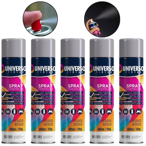 Tinta Spray 400ml Cinza Uso Geral em Aço Ferro Couro Gesso Cerâmica A Tinta Spray 400ml Cinza Uso Geral é a solução prática para renovar superfícies de metal, gesso, couro e cerâmica. Ideal para dar vida nova a bicicletas, móveis, eletrodomésticos e objetos em geral, garantindo um acabamento moderno e duradouro. Com fórmula de alta qualidade, oferece excelente aderência e acabamento Brilhante, além de resistência superior contra desgastes do dia a dia. Sua cobertura uniforme realça os detalhes e proporciona um resultado em poucas camadas. Prática e fácil de aplicar, a tinta spray seca ao toque em apenas 15 minutos, permitindo agilidade nos trabalhos e economia de tempo. O rendimento de até 2 m por demão garante maior aproveitamento do produto e ótimo custo-benefício. Diferenciais: Acabamento Brilhante com ótima aderência Alta durabilidade e resistência em ambientes internos e externos Secagem rápida e aplicação prática com cobertura uniforme Especificações TÉCNICAS: Volume: 400ml Rendimento: até 2 m por demão Superfícies indicadas: metal, gesso, couro e cerâmica Secagem: toque em 15 minutos Acabamento: Brilhante Recomendação: uso de primer para melhor desempenho Itens INCLUSOS: 05 Tintas Spray 400ml Cinza Uso Geral Marca: Não Informado