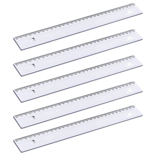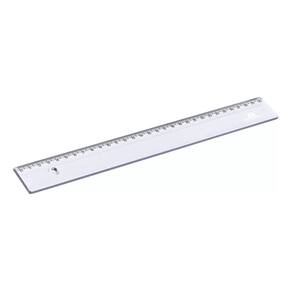 Régua em poliestireno, com escala de 30 cm gravada por transferência de imagem, garantindo alta precisão. Possui dois micro ressaltos na face que entra em contato com o papel para evitar o desgaste da escala. Cantos arredondados.