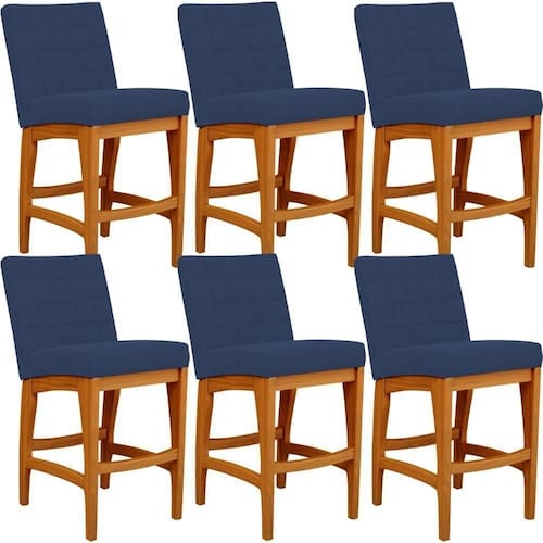Entregando muita excelência, o Kit 06 Banquetas Baixa Para Cozinha Bancada Bar Sala De Jantar 90 cm Fixa Mila L02 Suede Azul Marinho - Lyam Decor é o complemento que faltava para deixar sua casa ainda mais extraordinária. Seu encosto com costura em padrão quadriculado e assento estofados, centralizam em si uma graciosidade estonteante, sem perder todo o seu conforto. A estrutura em madeira, na cor nozes, também é digna de notoriedade, por imprimir bastante personalidade a sua decoração. Vale ressaltar ainda, o apoio para os pés que garante maior segurança à mesma.