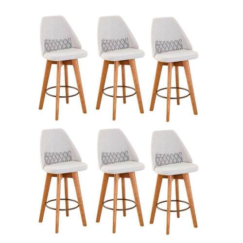 Kit 06 Banquetas Alta Maya Giratória Com Encosto Gourmet Linho Bege E Almofada Zigzag - Aurora Line Banqueta Maya Giratória - Aurora Line A Banqueta Maya possui assento e pés em madeira eucalipto com sistema giratório! Os pés contam com um reforço que proporciona um suporte de peso de até 120 Kgs.O assento é revestido com espuma D-23. Além de bonita e charmosa, vai trazer para seu ambiente elegância e proporcionará conforto para sua família e amigos nos momentos de lazer.