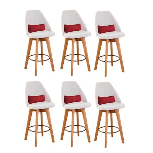 Kit 06 Banquetas Alta Maya Giratória Com Encosto Linho Bege Claro e Almofada Suede Vermelho - Aurora Line - Blush