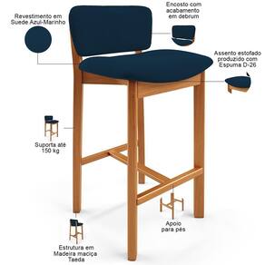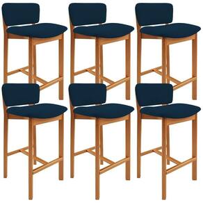 SizeDescription: Altura: 83cm x Largura: 47cm x Profundidade: 47cm | MaterialFamily: Madeira e Espuma | É cadeira de balanço: Não | Largura da cadeira: 47 cm | ProductWidth: 47 cm | Cor do assento: Azul Marinho | OriginCountry: | ProductWarranty: 90 dias após o do produto | Desenho do tecido: Liso | Fabricante: Lyam Decor | Profundidade do assento: 37 cm | É empilhável: Não | Largura do assento: 45 cm | Altura do assento a partir do solo: 74 cm | ProductInstructions: Produto para uso residencial em ambiente interno, não devendo ficar exposto diretamente ao sol, calo | Espessura do assento: na | Cor: Azul Marinho | Color: Azul Marinho | Model: Banqueta Dara | OriginState: PR | ProductContents: 06 Banquetas | Diâmetro: na | ProductHeight: 83 cm | ProductLength: 47 cm | SupplierSimpleName: Kit 06 Banquetas Alta Para Cozinha Sala de Jantar Bar Dara L06 Suede Azul Marinho - Lyam Decor | Tipo de produto: Banqueta | Estilo: Clássico | Com estofado: Sim | Largura: 47 cm | Peso: 60 Kg | Com rodas: Não | Com espaço de armazenamento: Não | Quantidade de Caixas de embalagem: 1 | Requer montagem: Não | Material do estofamento: Suede | Peso máximo suportado: 150 Kg | Com apoio de braços: Não | É dobrável: Não | Cor do estofamento: Azul Marinho | Cor da estrutura da cadeira: Castanho | Profundidade da cadeira: 47 cm | Altura da cadeira: 83 cm | Material: Madeira e Espuma | ProductWeight: 60 kg