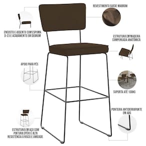 ColorSupplier: Marrom | Depth Front To Back: 58 | DepthWidthSideToSide: 58 | Profundidade: 58 | ColorFamily: Marrom | ColorSimple: Marrom | Color: Marrom | Altura: 102 | ProductHeight: 102 cm | ProductWarranty: 90 dias após o recebimento do produto | ProductContents: 06 Banquetas | OriginCountry: Nacional | ProductWeight: 60 kg | SupplierSimpleName: Kit 06 Banquetas Alta Para Cozinha Sala De Jantar Base Em Aço Allana L02 Suede Marrom - Lyam Decor | ProductWidth: 45 cm | MaterialFamily: Ferro | Model: Allana | ProductLength: 55 cm | ProductInstructions: Produto para uso em ambiente interno, nao devendo ficar exposto ao sol, calor e umidade excessivos. | Material: Ferro | SizeDescription: Altura: 102 cm Largura: 45 cm Profundidade: 55 cm | OriginState: PR | Largura: 45 | Lado a Lado: 58