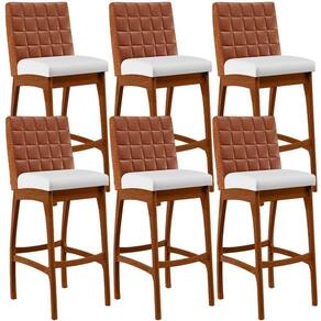 ndo muita excelência, o Kit 06 Banquetas Altas Cozinha Sala Jantar Fixa Mila B04 Couríssimo Camel Corano Branco - Lyam Decor é o complemento que faltava para deixar sua casa ainda mais extraordinária. Seu encosto com costura em padrão quadriculado e assento estofados, centralizam em si uma graciosidade estonteante, sem perder todo o conforto. A estrutura em madeira, na cor nozes, também é digna de notoriedade, por imprimir bastante personalidade a sua decoração. Vale ressaltar ainda, o apoio para os pés que garante maior segurança à banqueta.