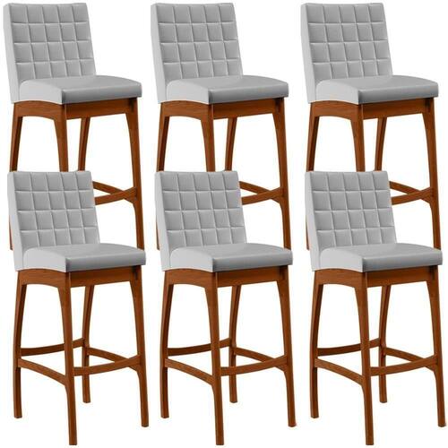 ndo muita excelência, o Kit 06 Banquetas Altas Para Cozinha Sala de Jantar Fixa Mila L02 Facto Cinza Metalizado - Lyam Decor é o complemento que faltava para deixar sua casa ainda mais extraordinária. Seu encosto com costura em padrão quadriculado e assento estofados, centralizam em si uma graciosidade estonteante, sem perder todo o seu conforto. A estrutura em madeira, na cor nozes, também é digna de notoriedade, por imprimir bastante personalidade a sua decoração. Vale ressaltar ainda, o apoio para os pés que garante maior à mesma.