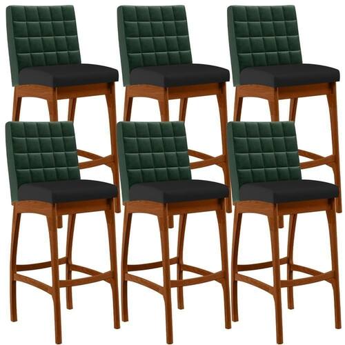 ndo muita excelência, o Kit 06 Banquetas Altas Cozinha Sala Jantar Fixa Mila B04 Facto Verde Musgo Corano Preto - Lyam Decor é o complemento que faltava para deixar sua casa ainda mais extraordinária. Seu encosto com costura em padrão quadriculado e assento estofados, centralizam em si uma graciosidade estonteante, sem perder todo o conforto. A estrutura em madeira, na cor nozes, também é digna de notoriedade, por imprimir bastante personalidade a sua decoração. Vale ressaltar ainda, o apoio para os pés que garante maior segurança à banqueta.