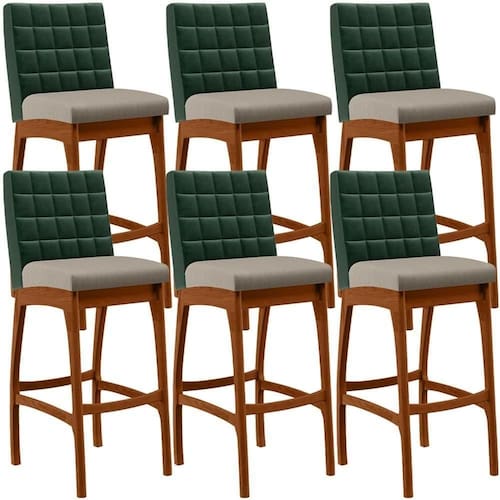 ndo muita excelência, o Kit 06 Banquetas Altas Cozinha Sala Jantar Fixa Mila B04 Facto Verde Musgo Linho Bege - Lyam Decor é o complemento que faltava para deixar sua casa ainda mais extraordinária. Seu encosto com costura em padrão quadriculado e assento estofados, centralizam em si uma graciosidade estonteante, sem perder todo o conforto. A estrutura em madeira, na cor nozes, também é digna de notoriedade, por imprimir bastante personalidade a sua decoração. Vale ressaltar ainda, o apoio para os pés que garante maior segurança à banqueta.