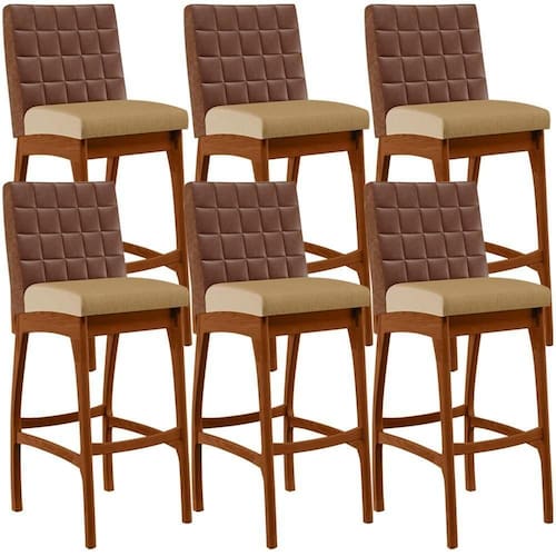 ndo muita excelência, o Kit 06 Banquetas Altas Sala De Jantar Fixa Mila B04 Couríssimo Marrom Linho Bege Escuro - Lyam Decor é o complemento que faltava para deixar sua casa ainda mais extraordinária. Seu encosto com costura em padrão quadriculado e assento estofados, centralizam em si uma graciosidade estonteante, sem perder todo o conforto. A estrutura em madeira, na cor nozes, também é digna de notoriedade, por imprimir bastante personalidade a sua decoração. Vale ressaltar ainda, o apoio para os pés que garante maior à banqueta.