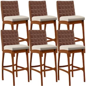 ndo muita excelência, o Kit 06 Banquetas Altas Cozinha Sala De Jantar Fixa Mila B04 Couríssimo Marrom Linho Cru - Lyam Decor é o complemento que faltava para deixar sua casa ainda mais extraordinária. Seu encosto com costura em padrão quadriculado e assento estofados, centralizam em si uma graciosidade estonteante, sem perder todo o conforto. A estrutura em madeira, na cor nozes, também é digna de notoriedade, por imprimir bastante personalidade a sua decoração. Vale ressaltar ainda, o apoio para os pés que garante maior à banqueta.