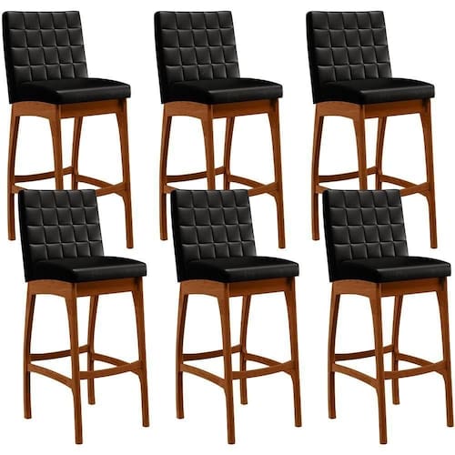 ndo muita excelência, a Kit 06 Banquetas Altas Para Cozinha Sala de Jantar Fixa Mila B04 Couríssimo Preto - Lyam Decor é o complemento que faltava para deixar sua casa ainda mais extraordinária. Seu encosto com costura em padrão quadriculado e assento estofados, centralizam em si uma graciosidade estonteante, sem perder todo o seu conforto. A estrutura em madeira, na cor nozes, também é digna de notoriedade, por imprimir bastante personalidade a sua decoração. Vale ressaltar ainda, o apoio para os pés que garante maior segurança à mesma.