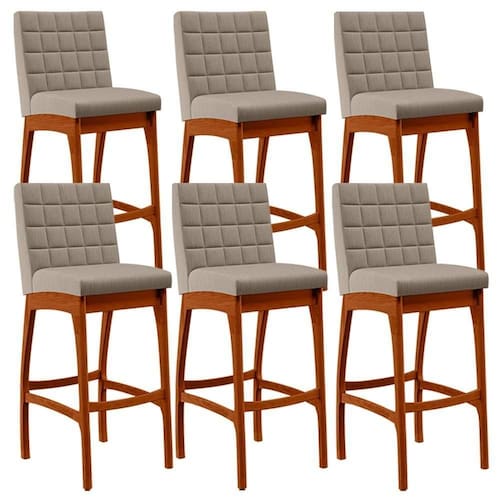 ndo muita excelência, a Kit 06 Banquetas Altas Para Cozinha Sala de Jantar Fixa Mila B04 Linho Bege - Lyam Decor é o complemento que faltava para deixar sua casa ainda mais extraordinária. Seu encosto com costura em padrão quadriculado e assento estofados, centralizam em si uma graciosidade estonteante, sem perder todo o seu conforto. A estrutura em madeira, na cor nozes, também é digna de notoriedade, por imprimir bastante personalidade a sua decoração. Vale ressaltar ainda, o apoio para os pés que garante maior à mesma.