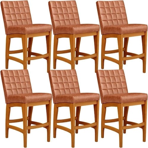 ndo muita excelência, o Kit 06 Banquetas Baixas Para Cozinha Bancada Bar Sala De Jantar 90 cm Fixa Mila L02 Couríssimo Camel - Lyam Decor é o complemento que faltava para deixar sua casa ainda mais extraordinária. Seu encosto com costura em padrão quadriculado e assento estofados, centralizam em si uma graciosidade estonteante, sem perder todo o seu conforto. A estrutura em madeira, na cor nozes, também é digna de notoriedade, por imprimir bastante personalidade a sua decoração. Vale ressaltar ainda, o apoio para os pés que garante maior segurança à mesma.