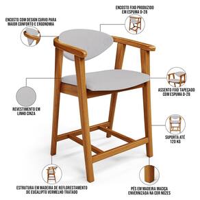 Características: Estrutura em madeira de reflorestamento de eucalipto vermelho tratado. Revestimento em tecido Linho de alta qualidade na cor Cinza. Assento e encosto fixos tapeçados com espuma D-28. Encosto com design curvo para maior conforto e ergonomia. Pés em madeira maciça envernizada na cor Nozes. Peso suportado: Até 120 kg.