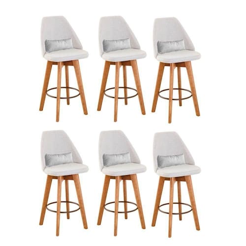 Kit 06 Banquetas Alta Maya Giratória Com Encosto Gourmet Linho Bege E Almofada Corino Branco - Gat Magazine Banqueta Maya Giratória - GAT MAGAZINE A Banqueta Maya possui assento e pés em madeira eucalipto com sistema giratório! Os pés contam com um reforço que proporciona um suporte de peso de até 120 Kgs.O assento é revestido com espuma D-23. Além de bonita e charmosa, vai trazer para seu ambiente elegância e proporcionará conforto para sua família e amigos nos momentos de lazer.