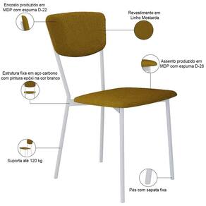ColorSupplier: Mostarda | OriginCountry: Brasil | ColorFamily: Amarelo | ProductContents: 06 Cadeiras | OriginState: PR | Material: Estrutura em Aço e MDP, Revestimento em Linho e espuma | MaterialFamily: Aço, MDP, Linho e espuma | SupplierSimpleName: Kit 06 Cadeira Para Sala de Jantar Village Branco C01 Linho Mostarda - Lyam Decor | ProductLength: 53 cm | ProductInstructions: Produto para uso em ambiente interno, nao devendo ficar exposto ao sol, calor e umidade excessivos. | ProductWeight: 39 kg | Color: Amarelo | Model: Village | ProductHeight: 249 cm | SizeDescription: Altura: 249 cm x Largura: 43 cm x Profundidade: 53 cm | ProductWarranty: 90 dias após o recebimento do produto | ProductWidth: 43 cm | ColorSimple: Amarelo | Cor: Amarelo