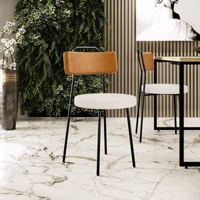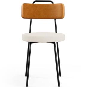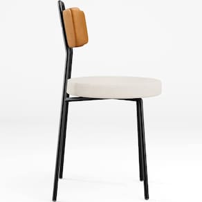 Revestimento do encosto em Couríssimo na cor Whisky e do assento em Linho na cor Cru, com acabamento semi brilho.