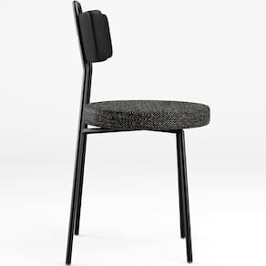 Revestimento do encosto em Couríssimo na cor Preto e do assento em Linho na cor Chumbo, com acabamento semi brilho.