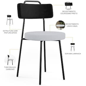 Revestimento do encosto em Couríssimo na cor Preto e do assento em Linho na cor Cinza, com acabamento semi brilho.