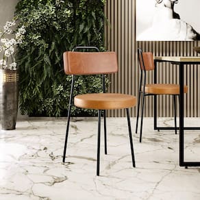 Revestimento do encosto em Couríssimo na cor Camel e do assento em Couríssimo na cor Whisky, com acabamento semi brilho.