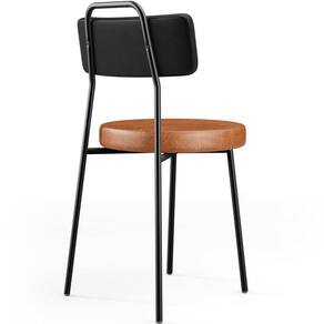 Revestimento do encosto em Couríssimo na cor Preto e do assento em Couríssimo na cor Camel, com acabamento semi brilho.