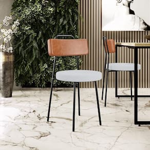 Revestimento do encosto em Couríssimo na cor Camel e do assento em Linho na cor Cinza, com acabamento semi brilho.