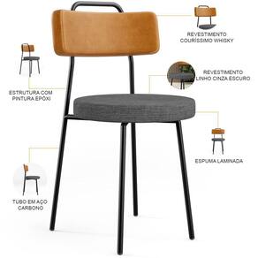 Amplamente moderna, dispondo de muito realce e design singular, o Kit 06 Cadeiras Decorativas Estofada Para Sala Jantar Barcelona L02 Couríssimo Whisky Linho Cinza Escuro - Lyam vem com a personalidade e elegância que sua decoração merece! Estruturada em aço carbono, contrasta lindamente com o encosto e assento estofados, cabe mencionar ainda seu revestimento em Couríssimo e linho, é confeccionada por materiais de excelente qualidade, extremamente resistentes e aconchegantes.